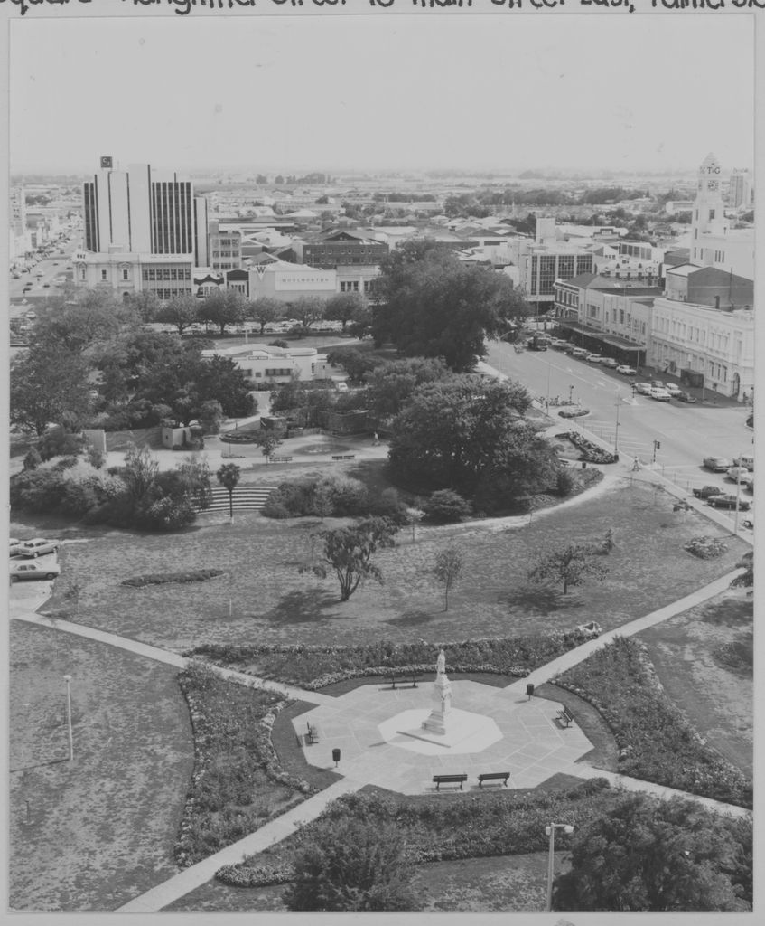 Looking down on The Square from Church Street side, with Rangitikei Street leading off, on the top, far left hand side. The marble statue of Te Peeti Te Awe Awe is in the front centre of the image. Te Peeti Te Awe Awe (c1820-1884), a chief of the Rangitane tribe, was involved with negotiations and the sale of Maori Land for the opening up of the Manawatu for pakeha settlement. The statue of was installed in The Square, Palmerston North, in January 1907. Also visible is Woolworths (corner of Broadway Avenue and The Square), the Ladies' Rest (art deco structure, centre) and the T&G tower (The Australasian Temperance and General Mutual Life Assurance Society Ltd (T&G) building, designed by A and K Henderson in the distinctive 'house' style developed by the firm and built 1938). Published in the Manawatu Standard 3 March 1980