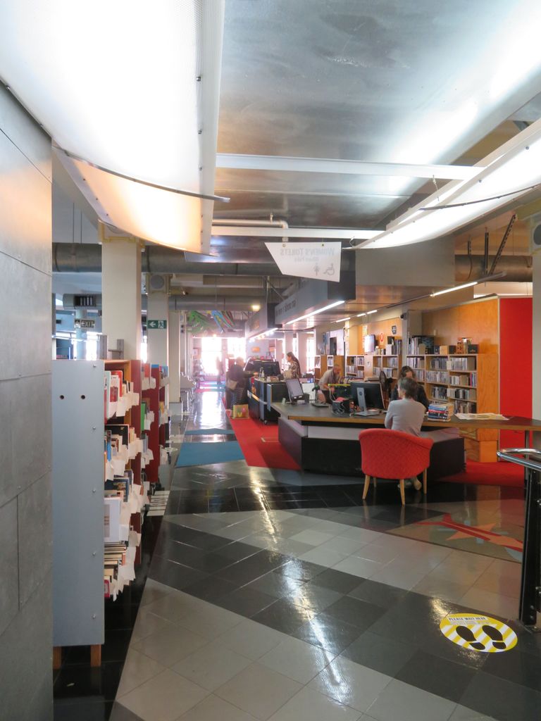 A view of the main desk at the Palmerston North City Library on the first day of re-opening during the COVID-19 pandemic.