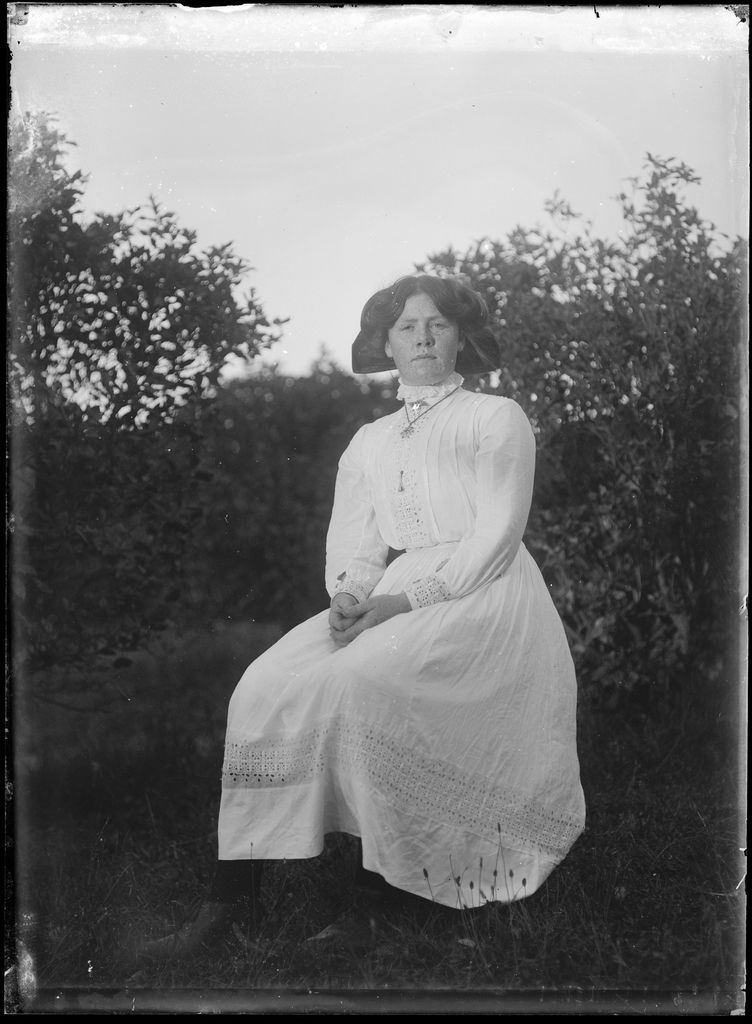 This photograph was created by William James Young in the early 20th century. A large variety of subjects are depicted in the collection, but family, rural life and travel are the most prominent themes. The exact location of the photographs in the Young Collection is unknown, but W J Young lived on a farm in Mt Stewart, Rangitikei, and some of the photographs include his house. The Young family were apparently avid travellers and photographs later in the collection feature scenes from Rotorua, Auckland, Whanganui, as well as other unidentified locations. The portraits are all unidentified, but are presumably of members of the Young family. The photographers parents were George Henry (b 1833) and Jane McDowell (b 1842, d 1916). They came to New Zealand in 1877. The same year, they bought the home farm on Mt Stewart and called it Kilrudden after Kilrudden House, the home of the McDowell family in Ireland. The couple had four children: Ann (b 1873), Margaret (b 1876), John (b 1878) and William James (b 1880). William James married Mary Elizabeth Thompson and they had four children: Doris (b 1914, d 1989), George (b 1916, d 1991), Royden McDowell (b 1925, d 1992) and Noel William (b 1927, d 2013).