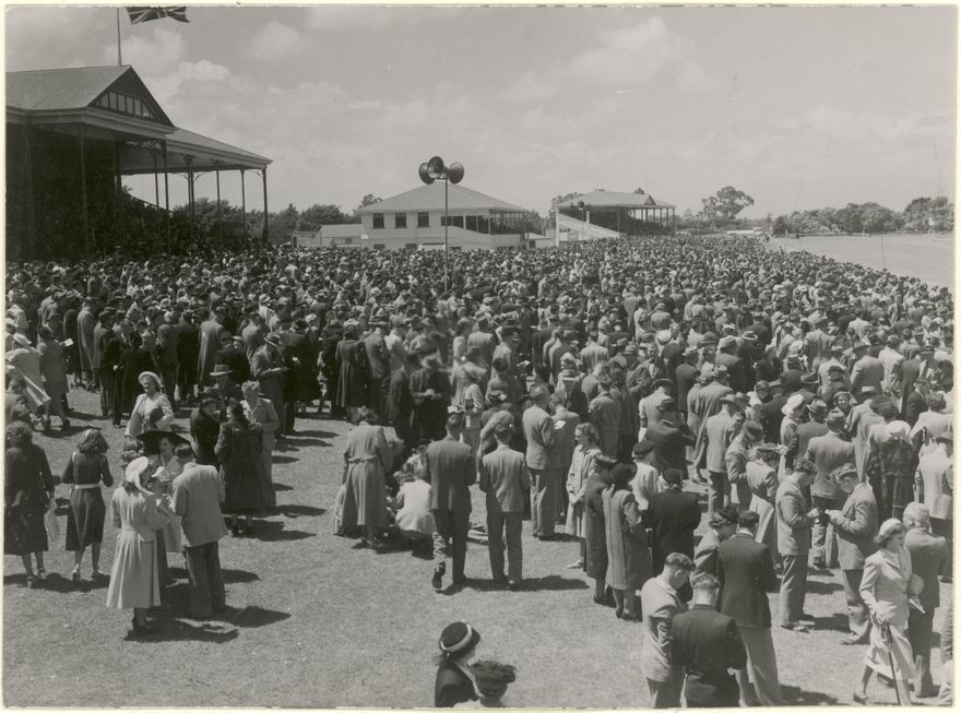 This photograph shows a large crowd at the winter meeting at the Awapuni Racecourse. The decision to begin race meetings in Palmerston North was made at a meeting of sportsmen in October 1880. D H McArthur was to be President. The first race couse was situated at the end of Park Road and met there from July 1883 until 1903 when the Awapuni Race course was brought into commission (due to erosion at the previous site). A branch railway was laid in 1905 to carry patrons from Palmerston North to the race course.