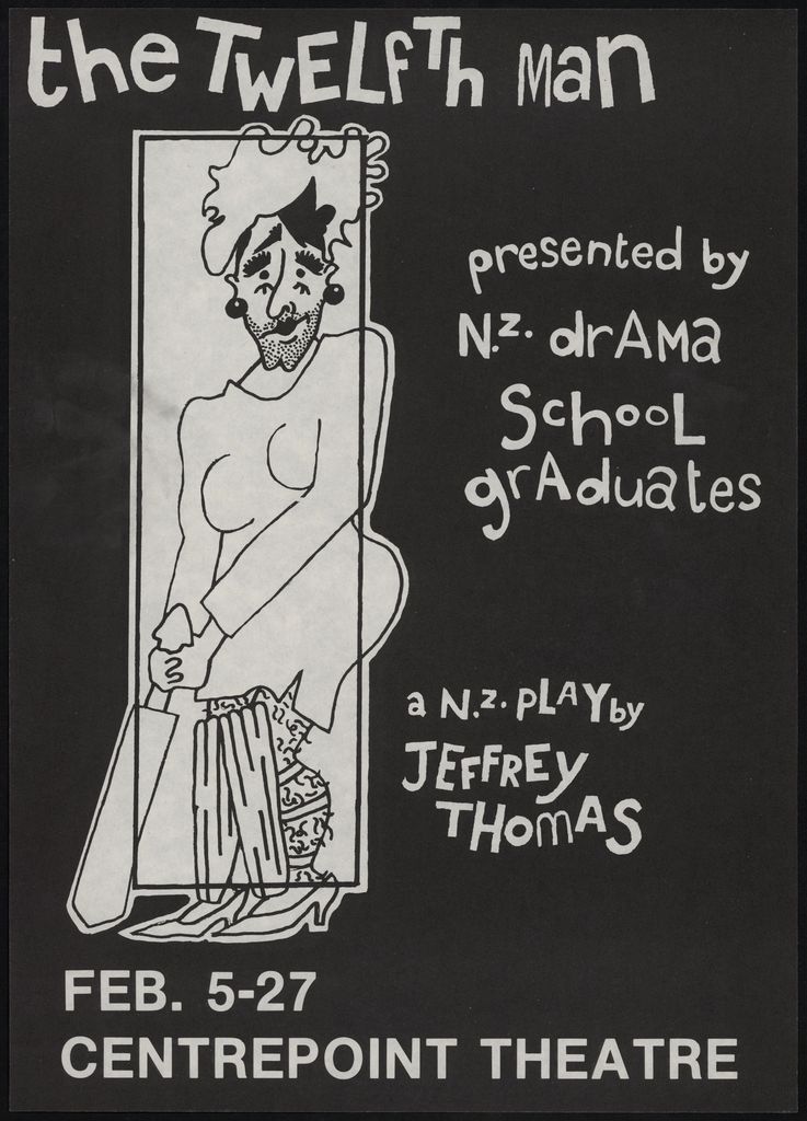 "The Twelfth Man presented by N.Z. Drama School graduates. A N.Z. Play by Jeffrey Thomas. Feb. 5-27. Centrepoint Theatre." Part of a collection of posters that were displayed in the Public Library in the 1970s - 1980s.