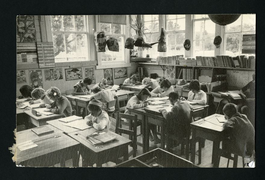 Fourteen students work in a classroom at Aokautere School. Aokautere School (formerly known as Fitzherbert East School) was established in 1889.