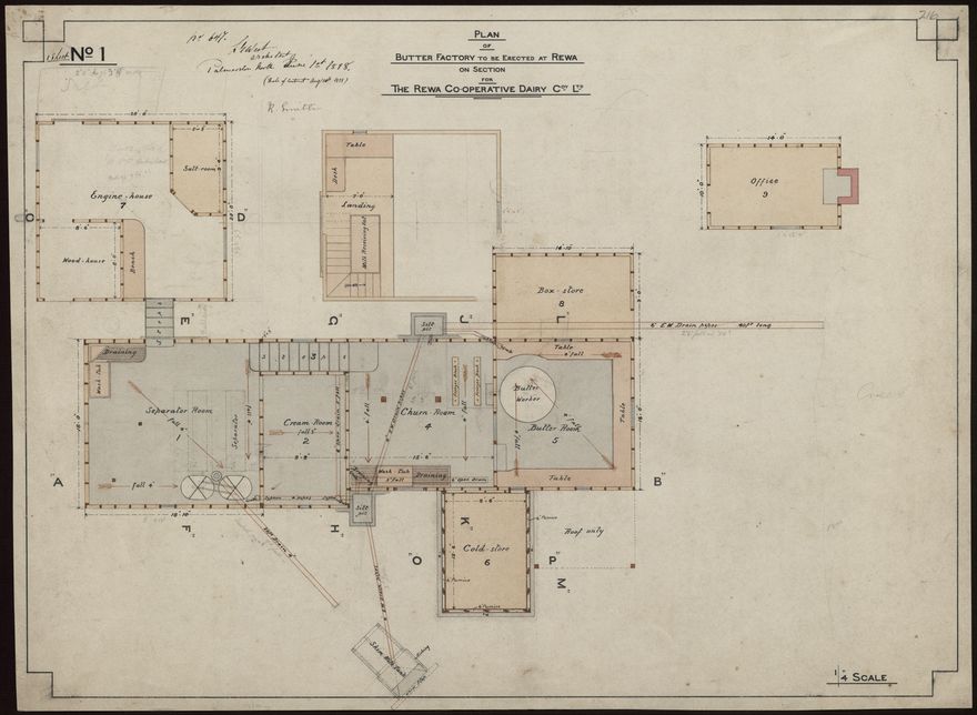 These plans for a butter factory were designed by L. G. West for the Rewa Co-operative Dairy Company Limited. The decision to found the company was made at a meeting of interested parties held in the Rewa School in April 1898 (Feilding Star, 4 April 1898). The Danish-born architect Ludolph Georg West (1846-1919) established an architectural practice in Palmerston North in about 1880. In 1912 he formed a partnership with his son, Ernest Vilhem West, who continued the business after his father's death.