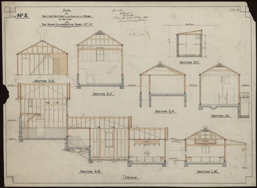 These plans for a butter factory were designed by L. G. West for the Rewa Co-operative Dairy Company Limited. The decision to found the company was made at a meeting of interested parties held in the Rewa School in April 1898 (Feilding Star, 4 April 1898). The Danish-born architect Ludolph Georg West (1846-1919) established an architectural practice in Palmerston North in about 1880. In 1912 he formed a partnership with his son, Ernest Vilhem West, who continued the business after his father's death.