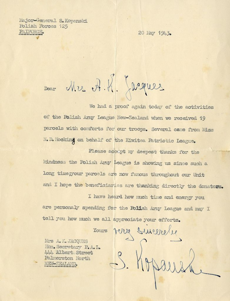 Letter from Major-General S. Kopanski to the Polish Army League, thanking them for parcels received, including from the Kiwitea Patriotic League.