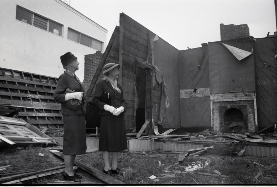 This photograph is from a series taken for a story that ran in the Manawatu Evening Standard, 24 February 1965 with the caption: "Mrs A W Adcock (right) is seen watching workmen during the demolition of her birthplace - an old 10 roomed house next to the Majestic Hotel in Fitzherbert Avenue. The house was built in 1885 for Mr W H Smith, who was editor and proprietor of the Manawatu Daily Times at that time. Mrs Adcock's sister, Mrs I M Smith, was also lived in the house before the turn of the century, wistfully surveys the scene."