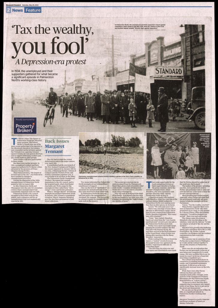 Local historians weekly "Back Issues" article in the Manawatū Standard. On 22 May 1934, the unemployed and their supporters gathered in Te Marae o Hine/The Square for what became a significant episode in Palmerston North's working-class history. Large crowds were attracted by the presence of Prime Minister George Forbes. Government policy changes that followed this demonstration was claimed by some sections of the Unemployed Workers' Movement as "a great victory".