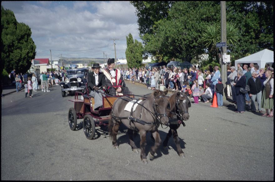 Paul Rieger, Mayor of Palmerston North being driven in a horse a trap, on the occasion of the Ashhurst (former) Post Office building's centenary. The building is now used at the town library.