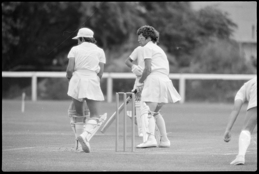 This image was taken (but not used) by the Evening Standard on 21st of January 1982. It depicts the New Zealand women’s cricket team taking on the International XI women’s team in a limited over match for the Hansell's Vita Fresh Women's World Cup 1981/1982. The match was held at Fitzherbert Park in Palmerston North. The New Zealand team won by 97 runs.