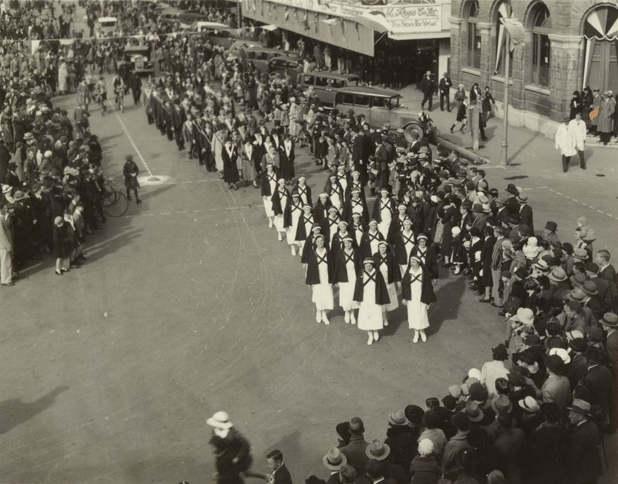 Palmerston North held celebrations to mark the coronation of King George VI and Queen Elizabeth. The procession started in The Square and was followed by a ceremony performed at the Showgrounds. Nurses march in a group, followed by others, around the corner of Coleman Place and The Square