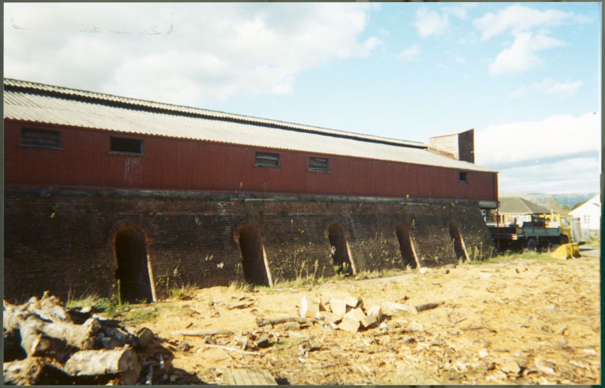 View of Hoffman Kiln taken from Featherston street. Robert Price Edwards (1854-1924) established his brick making business in Featherston Street in 1900 having shifted from previous premises in Dahlia Street. In 1904 Edwards started construction of the ‘Hoffman Kiln” which was the biggest constructed in Palmerston North and capable of continuous production. The Hoffman kiln is known as a “barrel kiln” and was capable of firing 9,000 bricks in a single chamber. This type of kiln used 25% less coal than contemporary downdraught kilns and it could be operated by a smaller skilled workforce. The kiln was last fired in 1959.