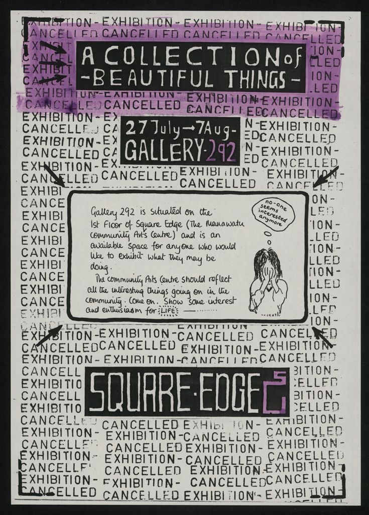 A Collection of Beautiful Things' 27 July - 7 August. Gallery 292. Gallery 292 is situated on the 1st floor of Square Edge (The Manawatu Community Arts Centre) and is an available space for anyone who like to exhibit what they may be doing. The Community Arts Centre should reflect all the interesting things going on in the community. Come on. Show some interest and enthusiasm for LIFE'. Square Edge'. Part of a collection of posters that were displayed in the Public Library in the 1970s - 1980s.