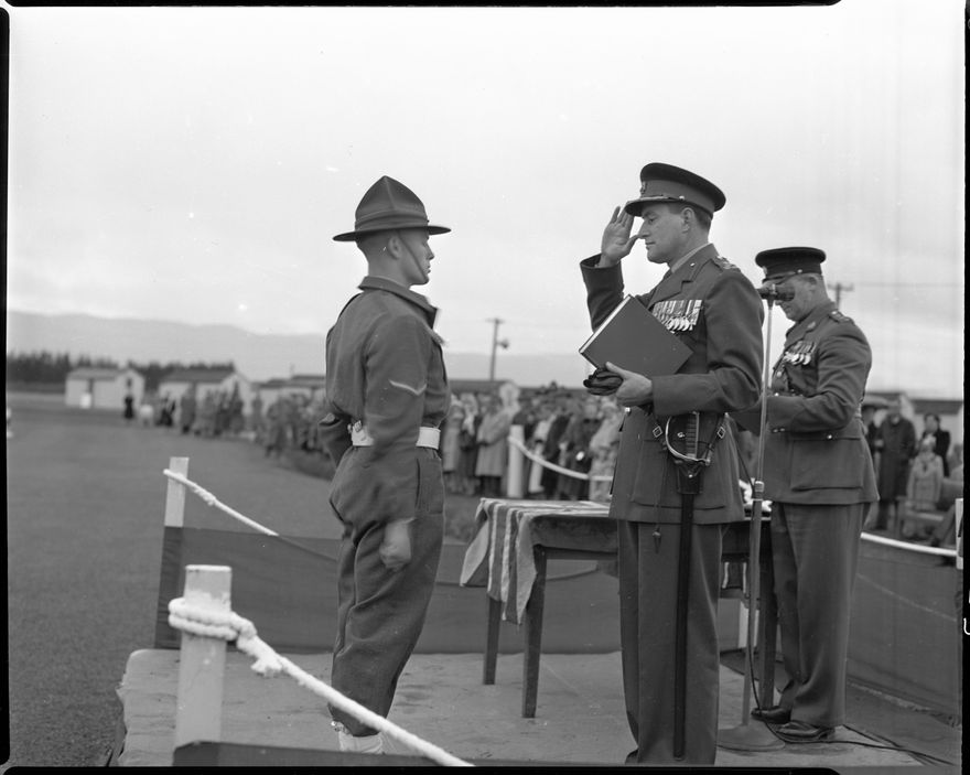 - A senior officer wearing medals salutes a soldier who is standing at attention. Both stand on a raised platform on the parade ground of the Linton Army Camp. This negative comes from the Elmar Collection - a large series of semi-identified and unidentified images from the 1930s-1970s.