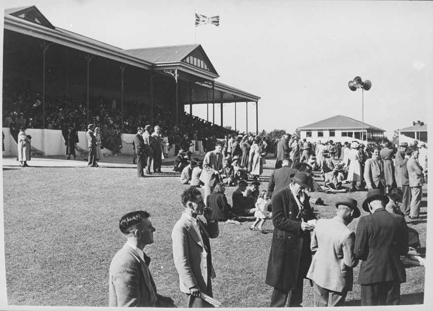 This image shows the Main Stand at the Awapuni Racecourse with a crowd of men, women and children assembled to watch the races.The Manawatu Racing Club opened their Awapuni course in December 1903. By 1927, over £90,000 had been spent on the establishment and improvement of the course and it was considered one of the most up-to-date and best equipped in the country.In February 1936, a violent storm severely damaged the Main Grandstand and most of the buildings (see STM 12 and STM 13). It cost nearly £4000 to repair the damage.The Main Grandstand is no longer in use at Awapuni Racecourse.