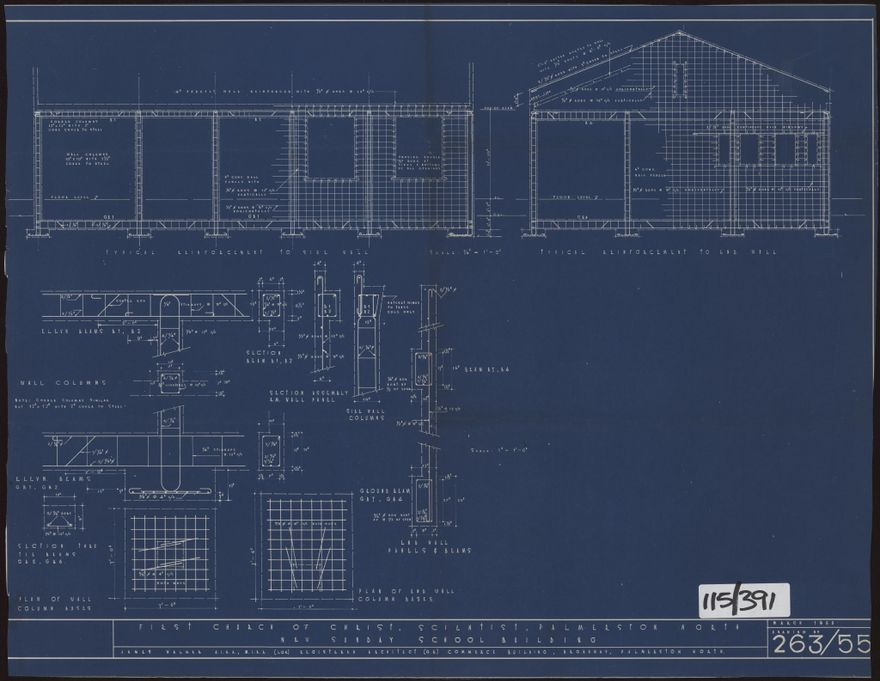 Blueprint of The First Church of Christ Scientist with drawings for the new Sunday School Building. Contains plans of walls, column bases, panels, beams and wall reinforcements.