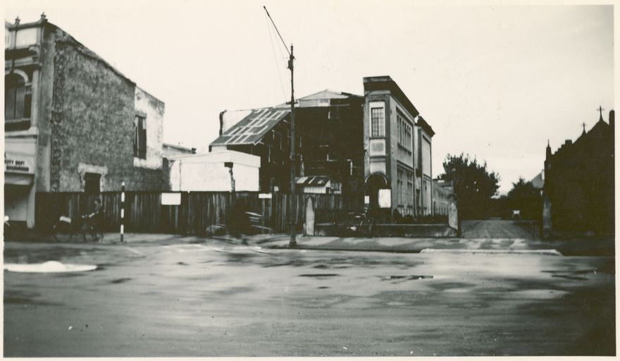 On this site, in the southern corner of The Square, beside All Saints Church, the Colonial Bank built at impressive and handsome brick edifice after a fire in 1891 swept through this part of town. That building was purchased by the Council in 1900 for the Public Library but in 1905 the Library was exiled to the corner opposite the Post Office and the Council itself moved in. The 1944 the building was demolished and this photograph (taken from in front of All Saints), looks back past the vacant lot towards the Evening Standard headquarters (1937 remodelled 1975-1976) and shows the site before the new building, now Square Edge, was erected.