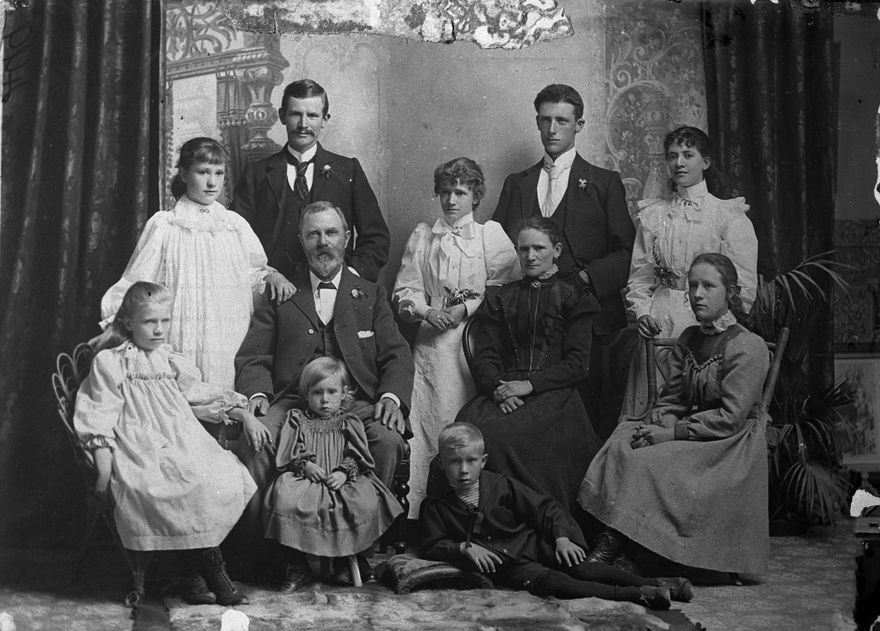 John Edmund Perrin (1844-1914) was partner in the firm of Meyrick, Perrin & Oakley, building contractors. Mrs Perrin (1854-1914) nee Montgomery, came with the Snelsons (early settlers) to Palmerston North in 1871. They married 1874. Standing from left: Isabel (Mrs C Allen, later Mrs W Howe’s); Ernest ('Son'); Rachel (Mrs E Pratt); John Halford; Ada (Mrs F Needham). Seated from left: Ethel (Mrs P Stuart); Mr John Edmund Perrin; Mrs Matilda Perrin; Gertrude (Mrs. P Larcomb). In front from left: Cecil; George.