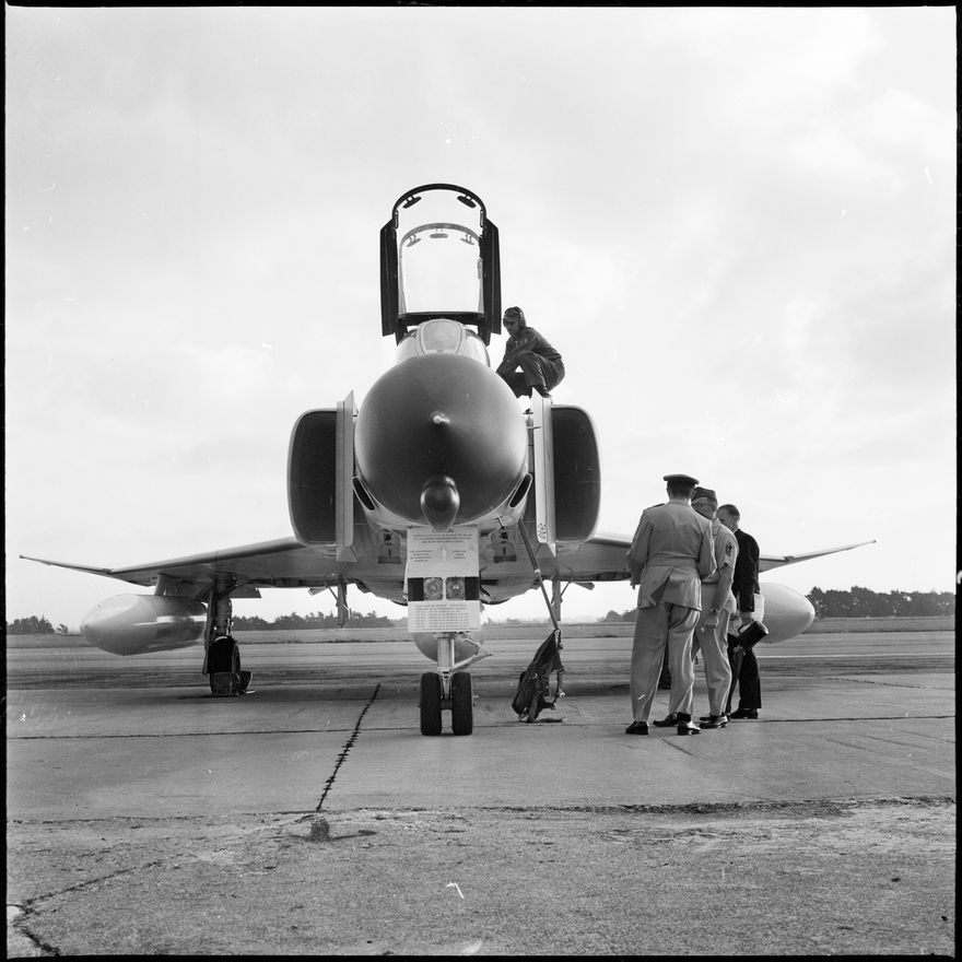 This image was taken for a story that ran in The Manawatu Evening Standard on 26th January 1966 "This is the fastest plane in New Zealand - a F-4C Phantom fighter-bomber, photographed on arrival at Ohakea air base last night. The Phantom can carry twice the bomb load of a World War II Liberator and has a maximum range of 2000 miles without resorting to in-flight refueling."