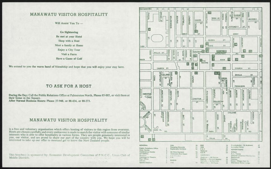 - A pamphlet published by New Zealand National Travel Association, Manawatu Branch, outlining a hosting service for overseas visitors.