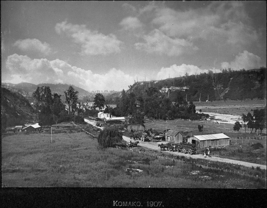 The township of Komako, Pohangina Valley, looking south down the river. The house on the far left was originally built for employees of Bartholemew’s Sawmill in the 1890s, before becoming the Blacksmith's residence. The white house in the distance was the Phelans' home, and was originally the Rimmer and Craven Store in the 1890s. The small dark building (5th from left) was a hut where the teamsters who drove for the Sash and Door Company stayed overnight, and the long building, far right, was used as stable for their horses.