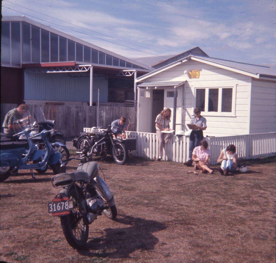 Students John Frith, Ralph Pond, Carol Turner, Brian Marshall, Lynette Rankin, and Janet Harder can be seen completing theory questionnaires, while sitting outside the hut belonging to the Palmerston North Motorcycle Training School.