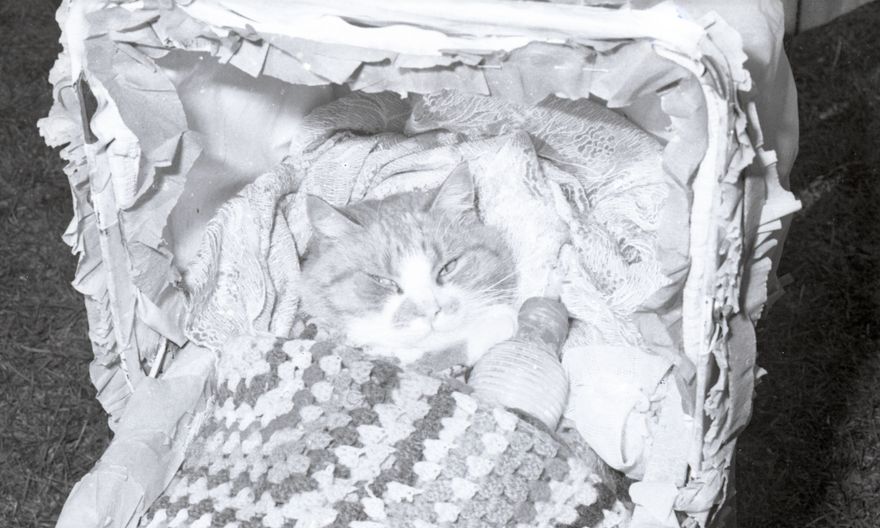 Caption: "Caryll Bond's pet cat 'James', is almost ready for her bottle."