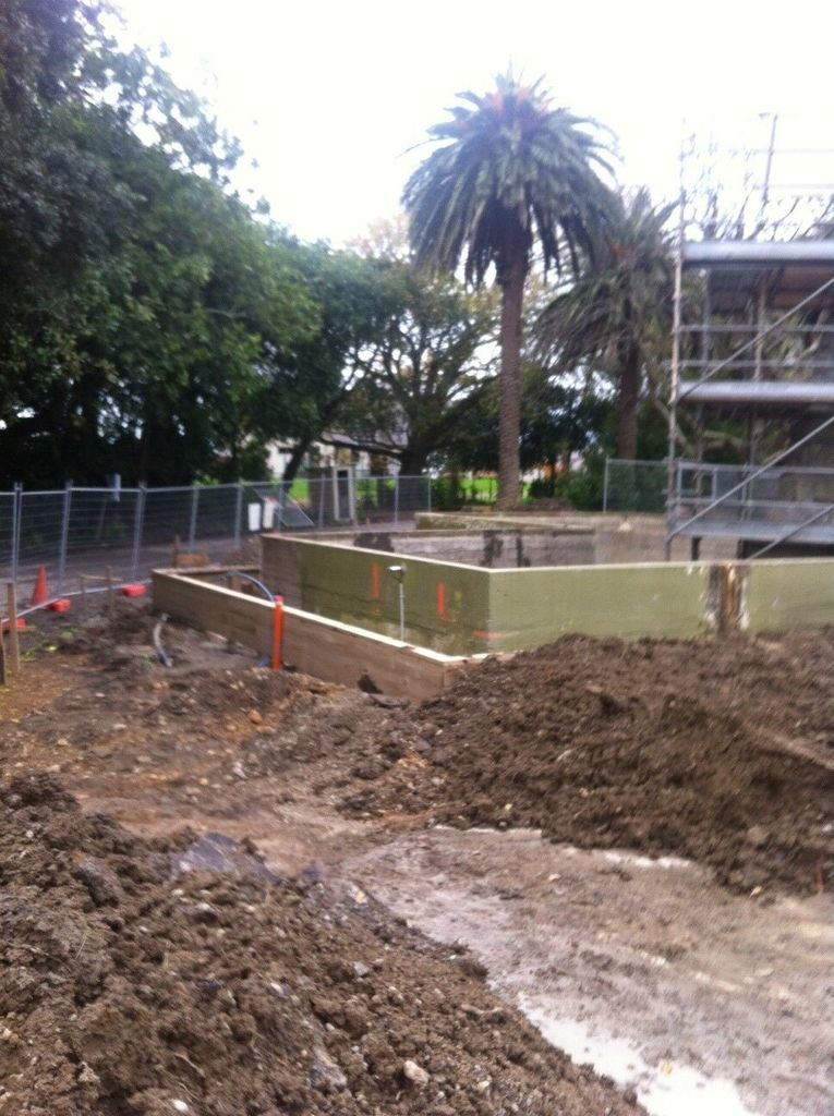A project got underway in 2014 to clean up and restore the Awapuni Memorial at the Palmerston North Racecourse. This photograph shows the site under construction at the June 30 2016 work day. The memorial, dedicated to the memory of officers and men of the New Zealand Medical Corps (1914-1918) who were trained at Awapuni Racecourse during WWI, was erected in 1929. The memorial is a stone cairn fountain, inside a pool constructed in the shape of a cross.