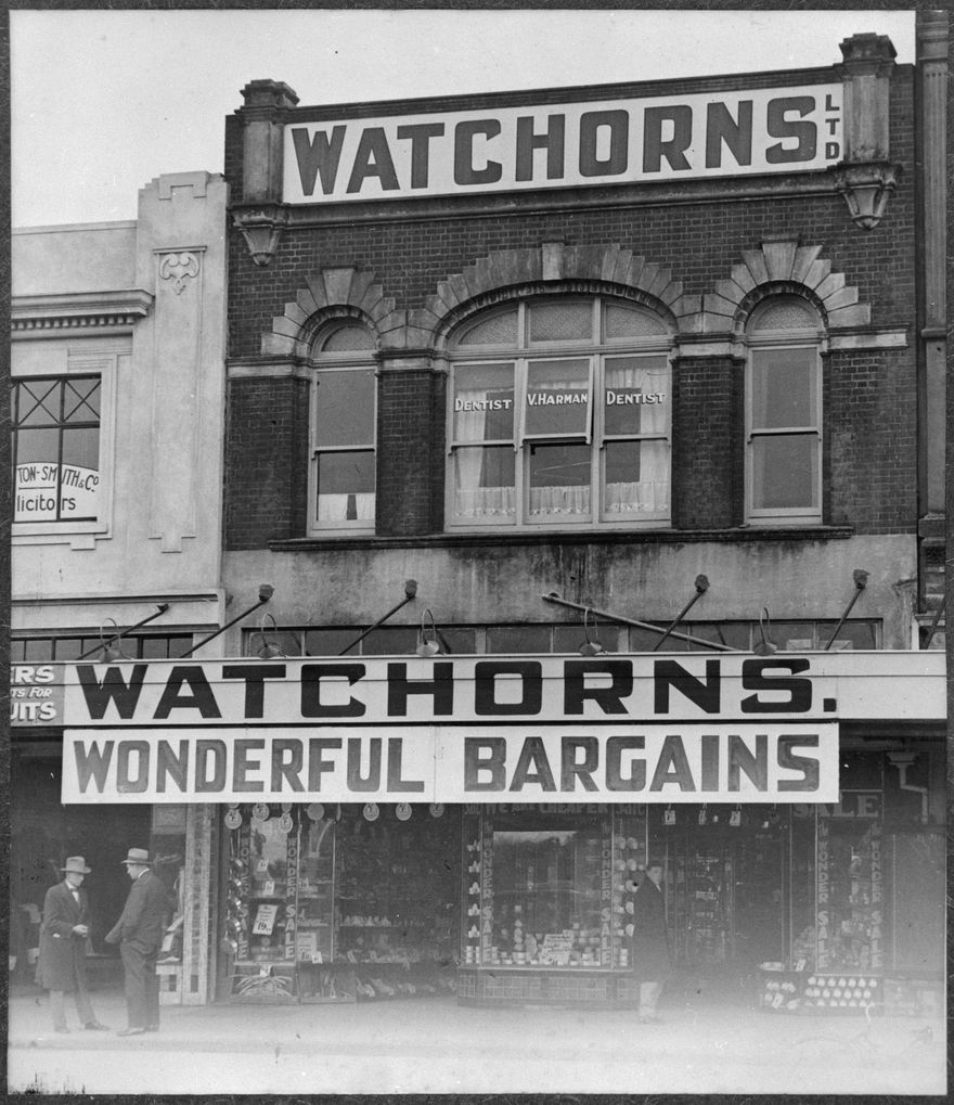 Watchorns was formerly on the corner of Albert Street and Broadway, Palmerston North. It was founded in 1923 as a partnership and known as Watchorn and McNaught. It specialised in crockery fancy goods and house hold items and here advertises the "wonderful bargains" available in-store. The building also contained the premises of Dentist V Harman. Smith and Co. Solicitors was located to the extreme left.