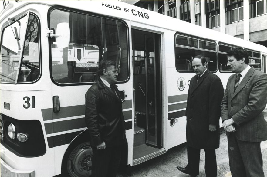 Parked outside the City Council administration building is one the new CNG fuelled passenger buses, built by NZ Motor Bodies Ltd. They began operating in Palmerston North 16 July 1980, and were believed to be the only ones in passenger service in the world in 1980. From left: John Galbraith, bus manager; Brian Elwood, Mayor; the Hon. Bill Birch, Minister of Energy. Published in the Manawatu Evening Standard 20 august 1980.