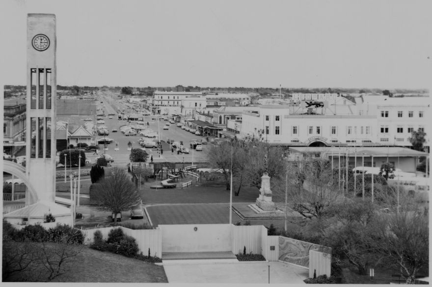 View from the top of the old Public Library building (now the Square Centre), this photograph looks towards Main Street West and overlooks the Lion's Den and playground. The playground was erected by the Leo Club in 1971 and removed in 1974 due to continued vandalism. It was relocated to other city parks. The Lion's Den was removed in the mid-2000s as part of an initiative to make The Square more safe. To the left is the Hopwood Clock Tower. Note that it has neither the single cross or the lantern cross on top. Note that 'Totoranui', which now sits outside Te Manawa Museum, stands on the corner of The Square and Main Street West - where the Palmerston North City Council's Civic Administration Building now stands [2014].