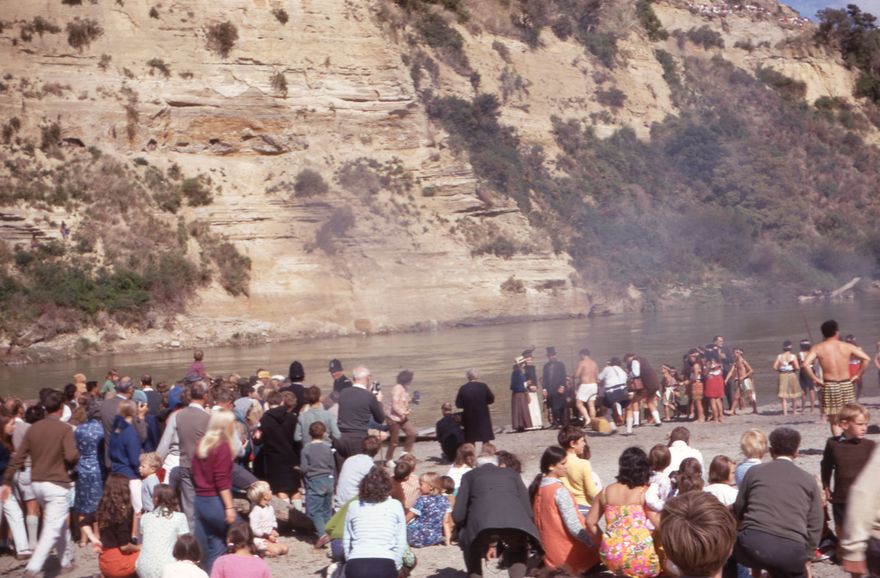 Crowds gather on the banks of the Manawatu River to watch the re-enacting of the arrival of settlers to Papaioea. Newspaper articles of the day were distressed by poor communication between City Council parking wardens, who had set up parking close to the river, and the Ministry of Transport staff, who stopped cars from getting to the parks, to avoid congestion and block the Governor General's access to the event.