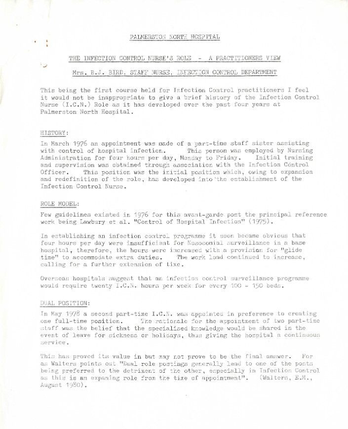 This paper comes from the Berry Bird Papers, held in the Palmerston North Community Archives. Berenice (Berry) Joubert Bird (1934-2020) was a nurse and leading advocate of infection control inititatives in the New Zealand healthcare system. In November 1976, Bird was appointed Staff Nurse in Infection Control at Palmerston North Hospital. She was promoted to the position of Charge Nurse Infection Control in 1980, then later to Nursing Supervisor, and subsequently Manager of Infection Control.
