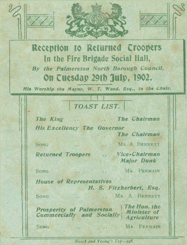 A reception, given by the Palmerston North Borough Council, for the returned troopers from the Boer War, was held at the Fire Brigade Social Hall, Palmerston North, 29 July 1902.