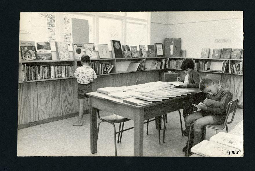 Three pupils in the library of Aokautere School, with some of the new books, presented for the opening by residents of the districts, parents and friends. Aokautere School (formerly known as Fitzherbert East School) was established in 1889.