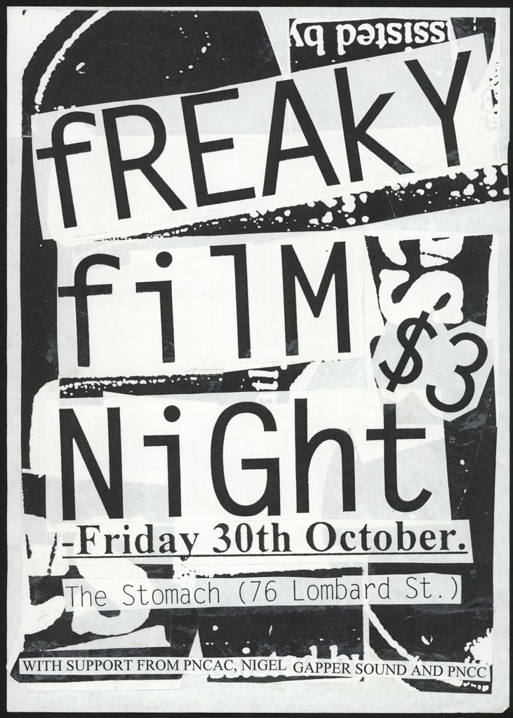 freaky film night. $3. Friday 30th October. The Stomach (76 Lombard St.) With support from PNCAC, Nigel Gapper Sound and PNCC.