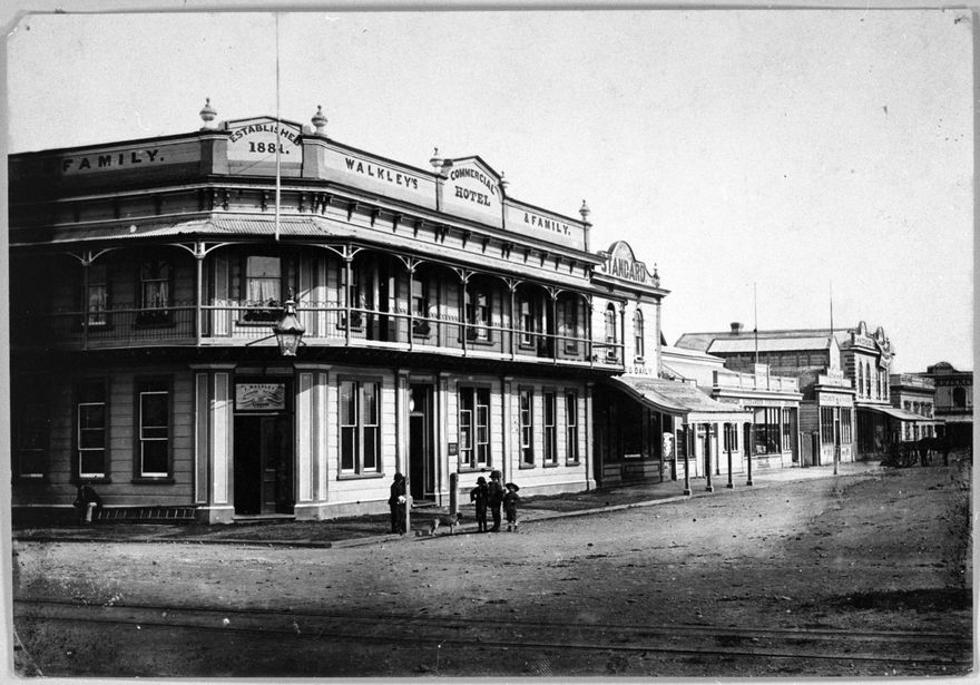Looking down Main Street West towards Coleman Place (now Coleman Mall). Walkley's Commercial and Family Hotel was built in 1881. It was previously occupied by the Commercial Hotel. The Standard building alongside the hotel is the first home of the Manawatu Evening Standard, from 1880 until 1900 when it burnt down. Alexander Ferguson's store and Snelson's Peoples Mart are also in the photo. The building on the corner is the Bank of Australasia, built in 1881.