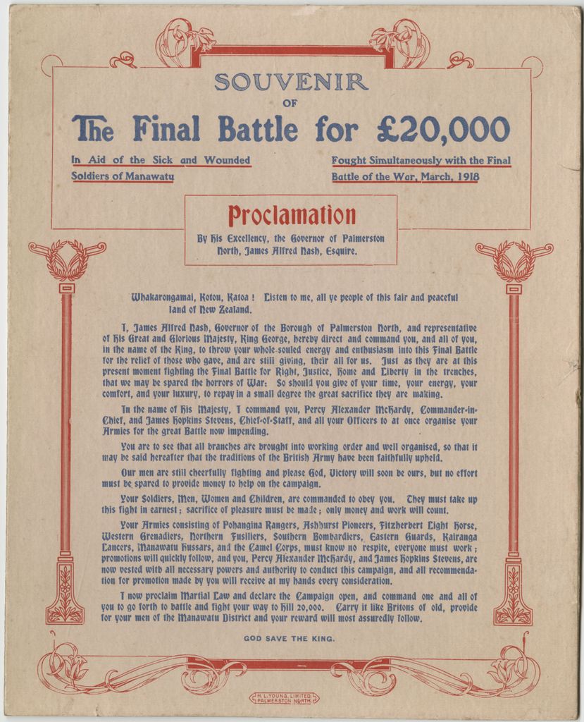 Souvenir - The Final Battle March 1918. Proclamation by his Excellency, The Governor of Palmerston North, James Alfred Nash, Esquire.