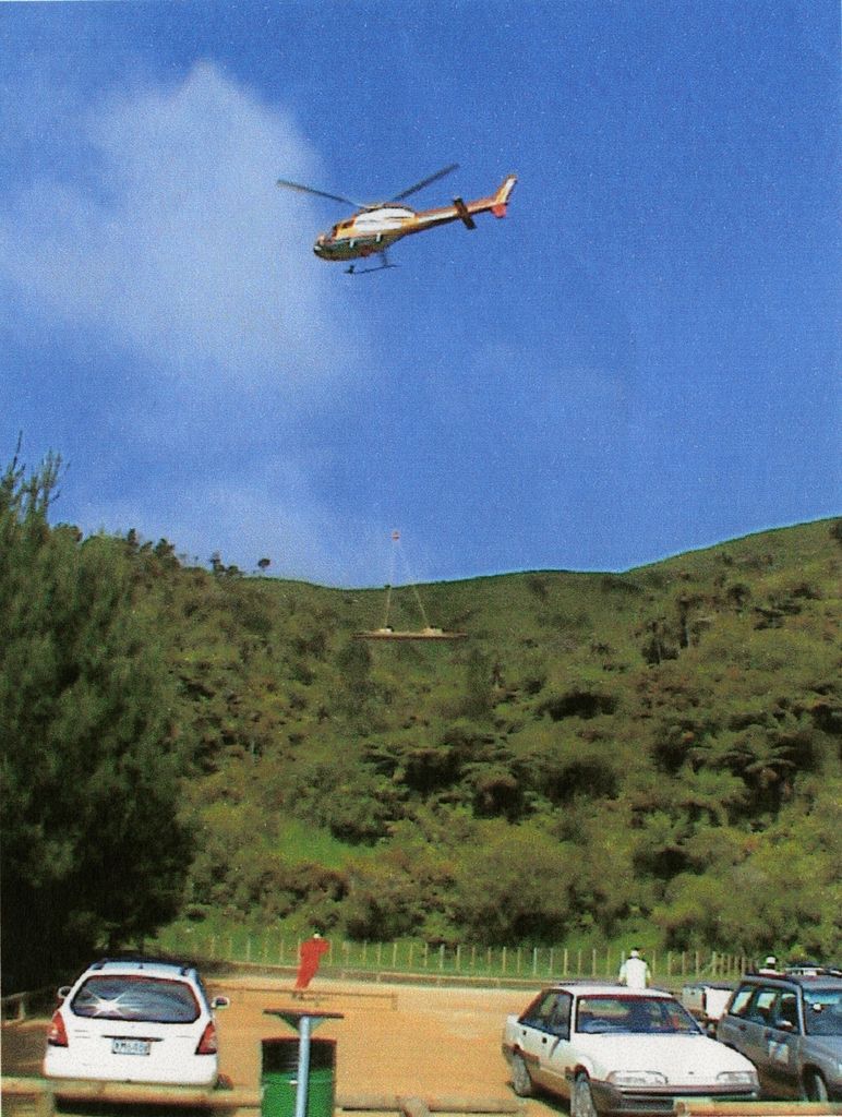 A helicopter was used to lift building materials, from a new carpark by the old Black Bridge, for the Sledge Track construction. The Sledge Track is located at the end of Kahuterawa Road, 17 km from the Palmerston North. It was opened in 2003. Ian Argyle proposed the development of the track to Palmerston North City Council in 1999, as part of the walkway network. Over the succeeding years, and following the original survey of the old road, Mr Argyle aided by volunteers, opened up and cleared what would become know as the 'Sledge Track".