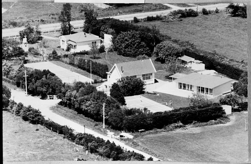 This photograph shows the grounds of Whakarongo School. The two classroom block visible here was erected in 1956.