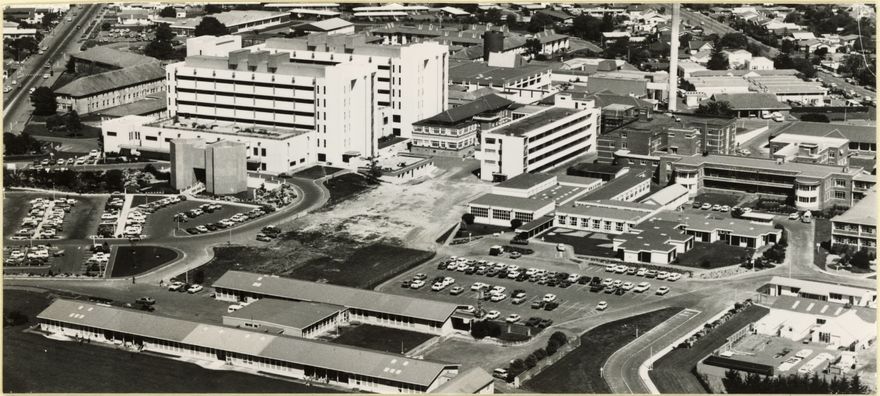 The Public Hospital as it was in 1980, showing the complex between Ruahine Street on the left towards Heretaunga street on the right.