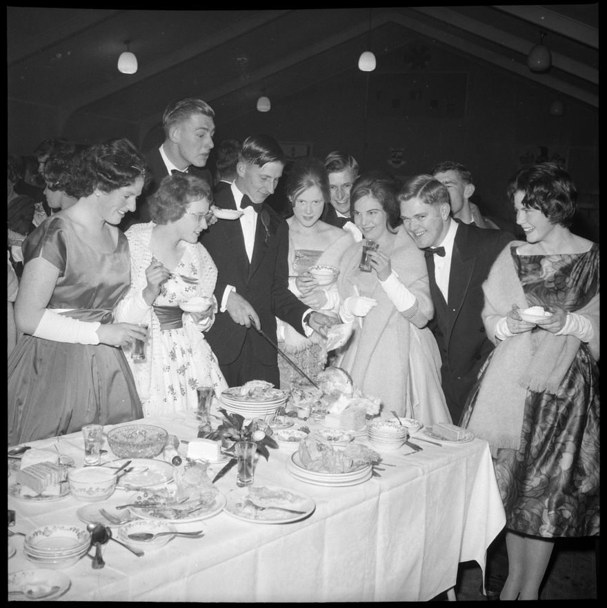 This image was taken for a story that ran in The Manawatu Evening Standard on 12 June 1961 "The Collegiate, Christ's, Woodford House and Nga Tawa old students' combined ball last Friday was preceded by a buffet dinner party. This was a popular innovation to a most successful evening."