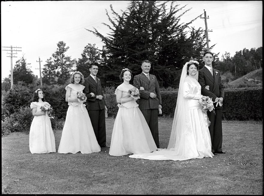 This photograph shows the bride and groom, alongside two sets of bridesmaids and groomsmen with a flower girl.