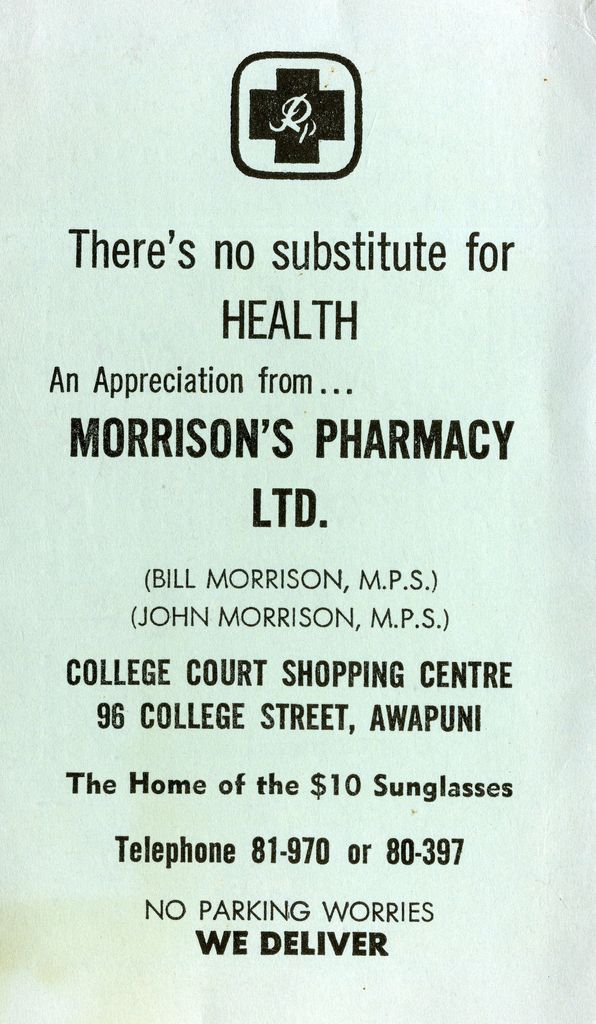 - The cover of a 'give-away' notepad from Morrisons Pharmacy, 96 College Street, Palmerston North. At this period of time it was owned by Bill Morrison, and John Morrison.