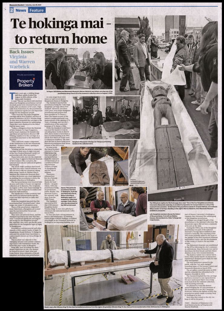 Local historians weekly "Back Issues" article in the Manawatū Standard. On 3 August 1993, four Rangitanē pouwhenua (carved stockade posts) were returned home to the region after an absence of 60 years, from the Museum of New Zealand, Te Papa Tongarewa.