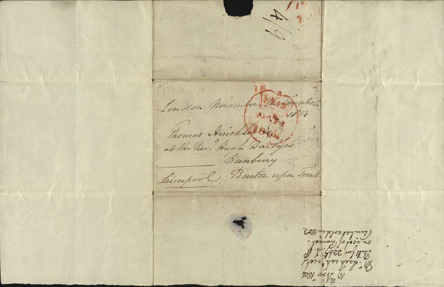 This record served as an envelope around a letter, from London dated 17 November 1804, addressed to Thomas Hinckley Esquire, at the Rev. Hugh Bailyes, Hanbury, Burton upon Trent. Also recorded in a different hand, and dated 19 November 1804 is, 'Mr Lack ... receipt of Bill for 336(7?).4.6d on account of Forest Timber sold in 1803'. This record is part of a collection relating to Lord Palmerston (1784-1865), after whom Palmerston North was named. The donor of the Lord Palmerston collection, F C Holland of England (who was interested in philately and postal history) donated items relating to Lord Palmerton during the 1970s, after visiting Palmerston North.