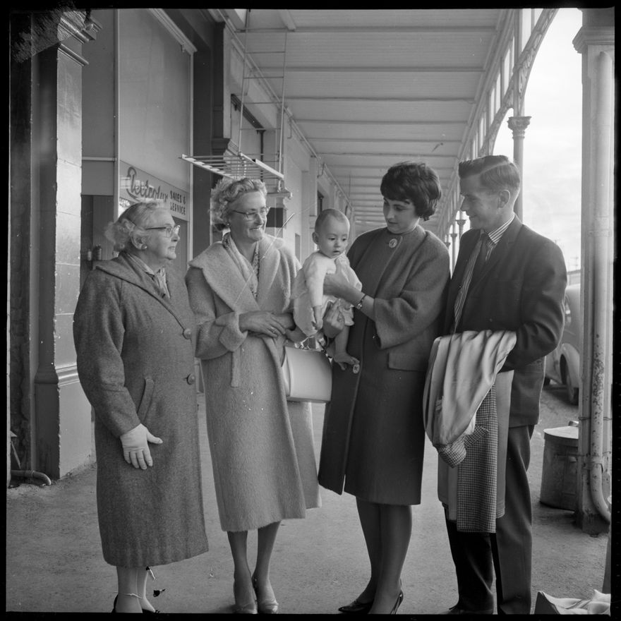 This image was taken for a story that ran in The Manawatu Evening Standard on 14th February 1963. "Mr and Mrs R. Sella and their son David were greeted in Palmerston North yesterday by Mrs Sella's mother, Mrs L. Neal , of Paihiatua, and her grandmother, Mrs M. McDonald of Dannevirke. Mr and Mrs Sella returned yesterday from 18 months in England visiting Mr Sella's relatives ."