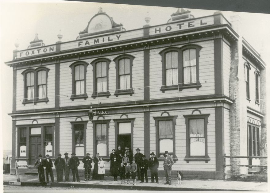 - A portrait of members of the Foxton Floral Committee in front of the Foxton Family Hotel.
