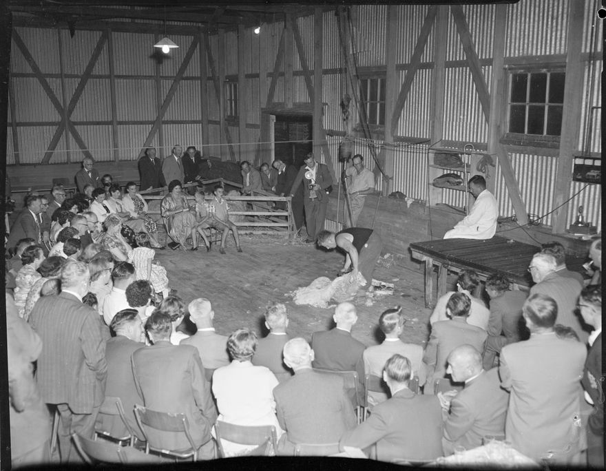 This image was not published in The Manawatu Evening Standard, taken on 16 December, 1959. “Palmerston North Rotary Club learned the finer points of shearing." Another photo associated with this article was published on the 16 December, 1959.