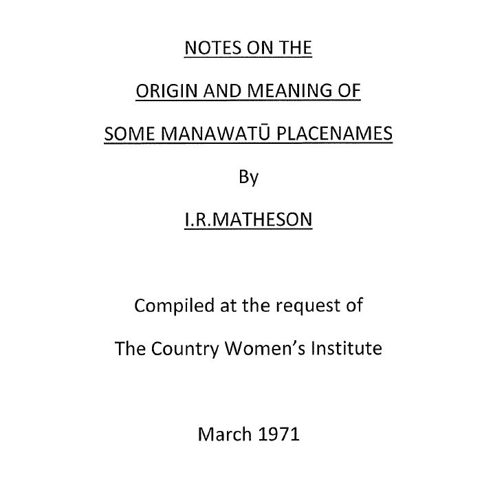 - A research file detailing place names in the Manawatū region that was compiled by Ian Matheson at the request of The Country Women's Institute.