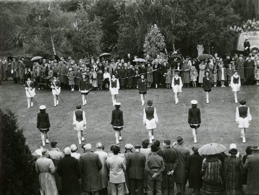 Marching girls perform for the crowed attening the unveiling ceremony. The obelisk at Fitzroy Park, as it was then called, was unveiled in this ceremony by Major-General Sir Howard Kippenberger. Marching girls performed as part of the occasion. Later, in 1954, the park was dedicated and renamed Memorial Park. The obelisk, in a state of disrepair, was removed in 1983 and now only the gates into the park remain as the memorial.
